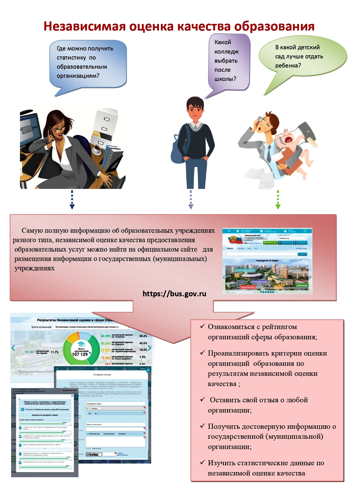 Принять участие в оценке качества условий оказания услуг образовательными организациями можно через официальный сайт bus.gov.ru или перейти по ссылке.
