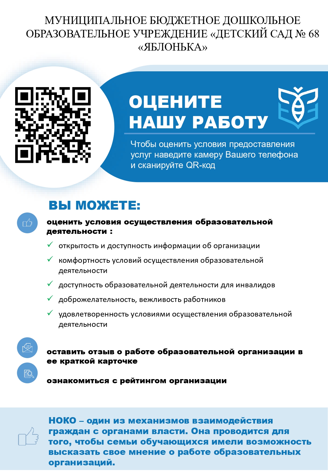 РЕЗУЛЬТАТЫ проведения независимой оценки качества оказания услуг МБДОУ «Детский сад 68 «Яблонька» в 2022г