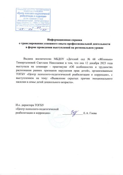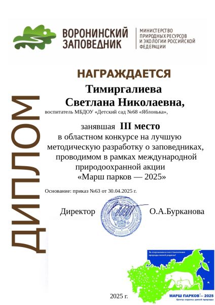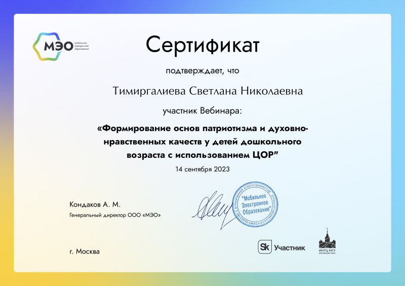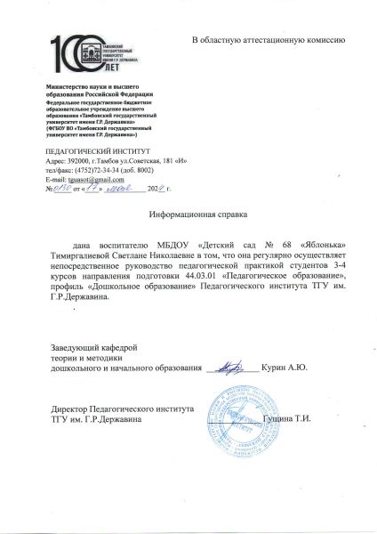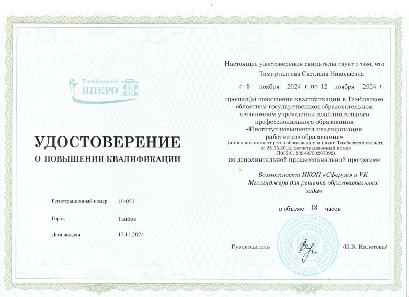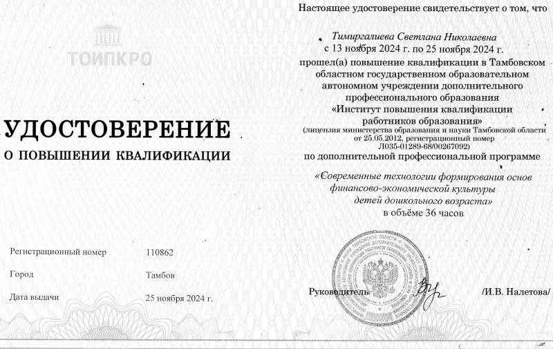 Образование: Средне-специальное, ТОГАОУ СПО «Педагогический колледж» г.Тамбова, 2022г Специальность: «Дошкольное образование». Квалификация: «Воспитатель детей дошкольного возраста». Общий стаж работы: 18 лет. Педагогический стаж работы: 3 года. Категория: Соответствие занимаемой должности "воспитатель", 2023. Курсы повышения квалификации: "Возможности ИКОП "Сферум" и VK Мессенджера для решения образовательных задач" 2024; "Современные технологии формирования основ финансово-экономической культуры детей дошкольного возраста" 2024; "Инклюзивное образование детей с ОВЗ в дошкольной образовательной организации согласно ФГОС и ФАОП ДО" 2024; «Организация и содержание образовательной деятельности воспитателя дошкольной образовательной организации в условиях реализации ФОП дошкольного образования» 2023; «Обучение по оказанию первой помощи пострадавшим» 2024